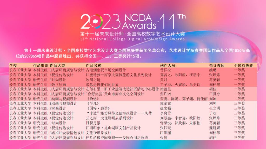 新闻网讯(通讯员 刘桂华)8月25日,第十一届未来设计师•全国高校数字艺术设计大赛(简称NCDA大赛)国赛获奖名单公布,公司共获国家级奖项15项,其中一等奖4项、二等奖3项、三等奖8项;3人获全国优秀组织教师,4人获全国优秀指导教师。