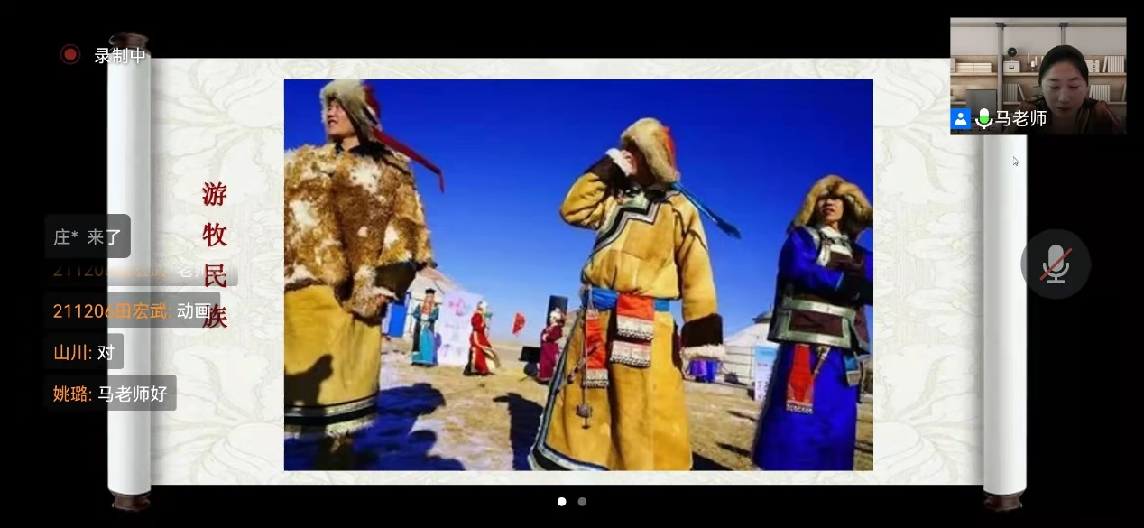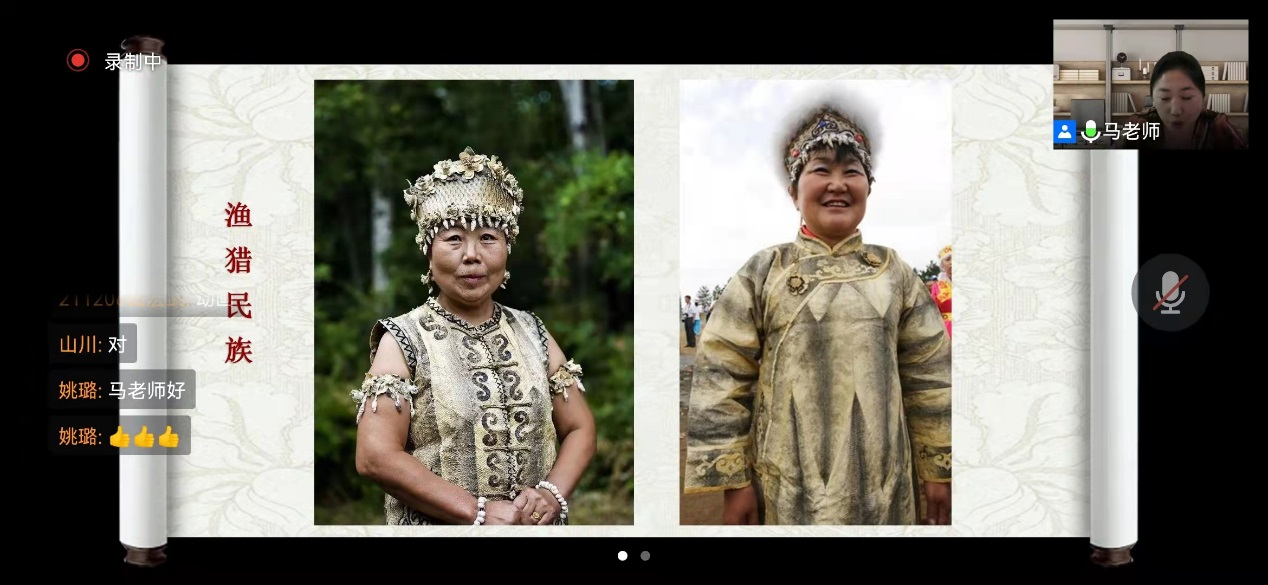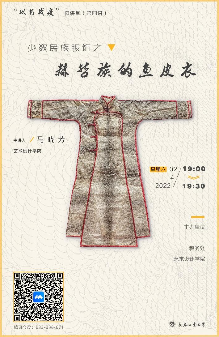 4月2日晚19:00时,第四讲《少数民族服饰之赫哲族的鱼皮衣》由艺术设计公司马晓芳老师主讲。马晓芳老师讲授了赫哲族的历史和文化,通过专题短片介绍了怎样将鱼皮制作成为可以具备折叠、缝合条件的制衣材料。同时演示了拼花、拼色,特殊的缝合技法,将一件具有赫哲族特色的鱼皮衣制作完成的过程。