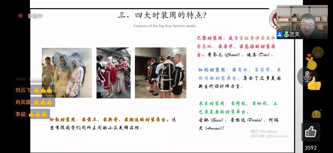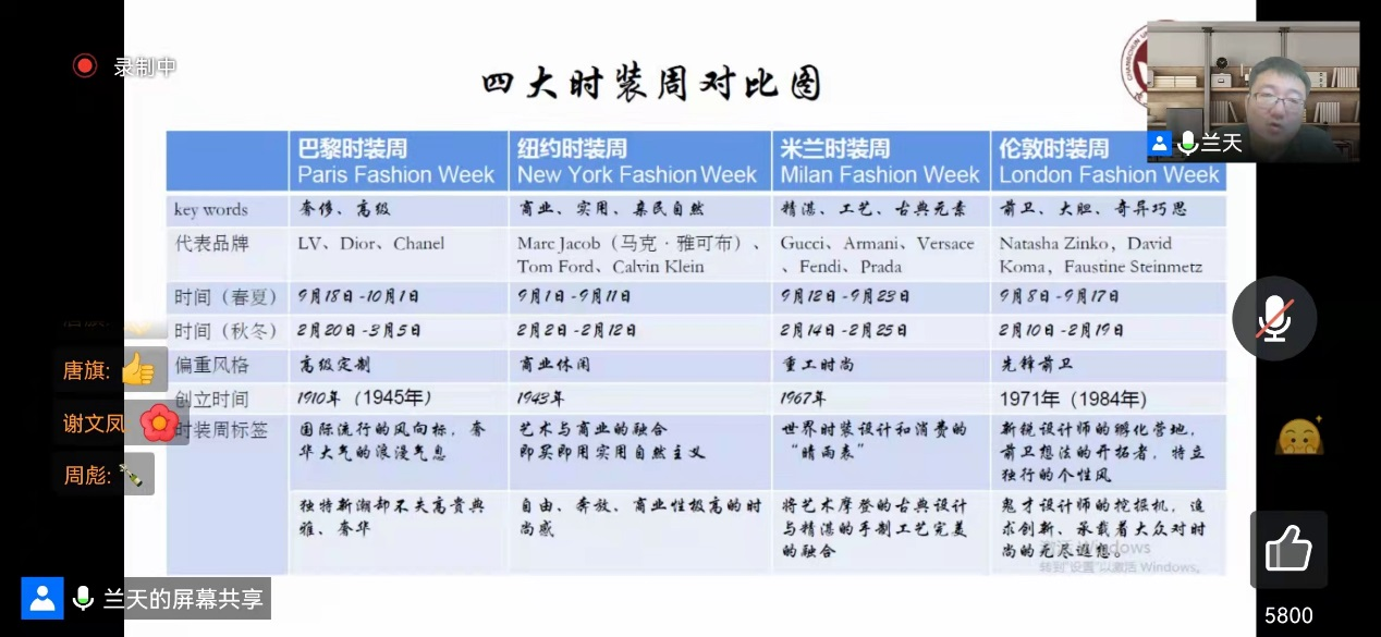 4月4日晚19:00时,第五讲《时装周的前世与今生》由艺术设计公司兰天老师主讲。兰天老师从时装周的缘起、发展,目前全球范围内四大时装周的代表品牌、发布时间、偏重风格等做了对比分析。同学们纷纷表示对于每年喜欢的新春时装发布活动轨迹有了全新的认识,特别适合青年人追逐生活中时尚风潮。